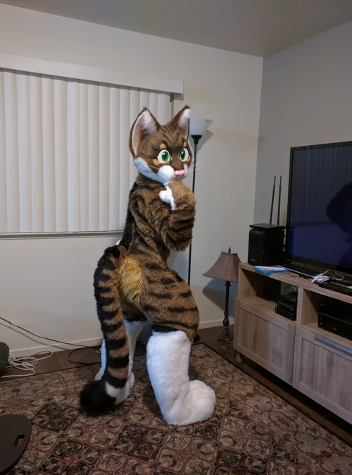 Snickers is an original design and character by Dragon Soup. This was their first attempt at hollow leg padding. The legs separate just below the knee with a zipper. The head is all foam with 12v fans in the ears that exhaust hot hair. The rust fur is a custom run by Fursuitsupplies.com.